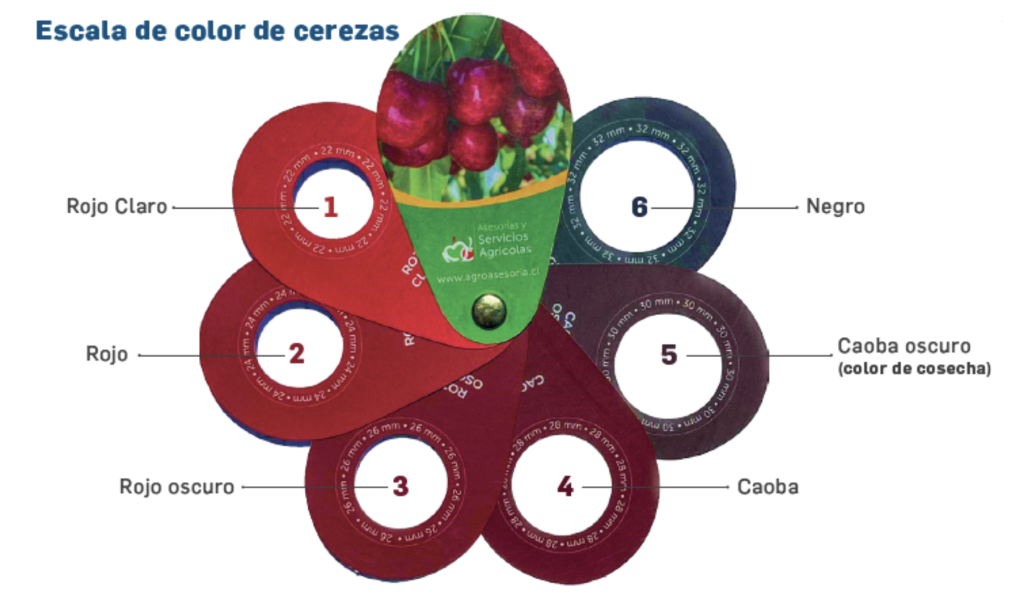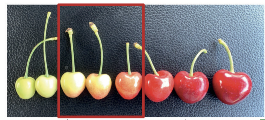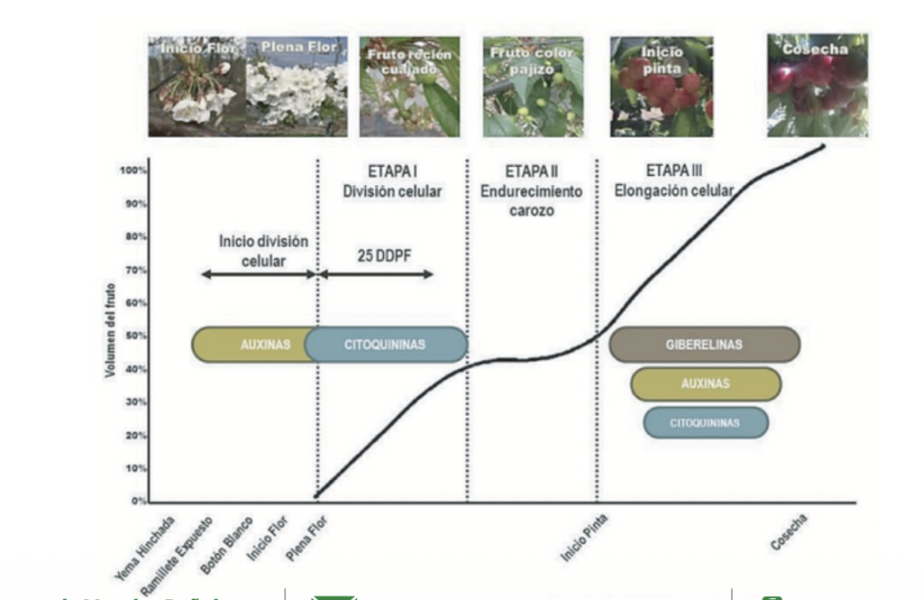 Complementario a la aplicación de citoquinina para potenciar la etapa I de crecimiento del fruto y mejorar calibre, la otra etapa importante al momento de definir el calibre de la fruta corresponde a la etapa III de crecimiento y desarrollo del fruto, donde la hormona responsable de este proceso es Ácido giberélico, que se encarga principalmente de la elongación celular. Esta aplicación se debe realizar desde color pajizo, ya que aplicaciones muy tempranas en el estado de crecimiento del puede retrasar principalmente la síntesis de pigmentos que dan origen al color de la fruta. Uno de los factores limitantes al momento de hablar de calidad de fruta, es la acumulación de materia seca en frutos y solidos solubles, lo cual se ve alterado por diversos factores como primaveras frías, nutrición, riego y manejo de los reguladores de crecimiento. Para favorecer la acumulación de materia seca y obtener una fruta donde la madurez comercial y madurez fisiológica coincidan, para determinar la fecha ideal de cosecha, es recomendable realizar aplicaciones de emparejadores de color, los cuales nos ayudarán a obtener color, homogenizar y concentrar cosecha.