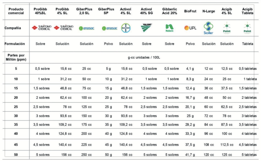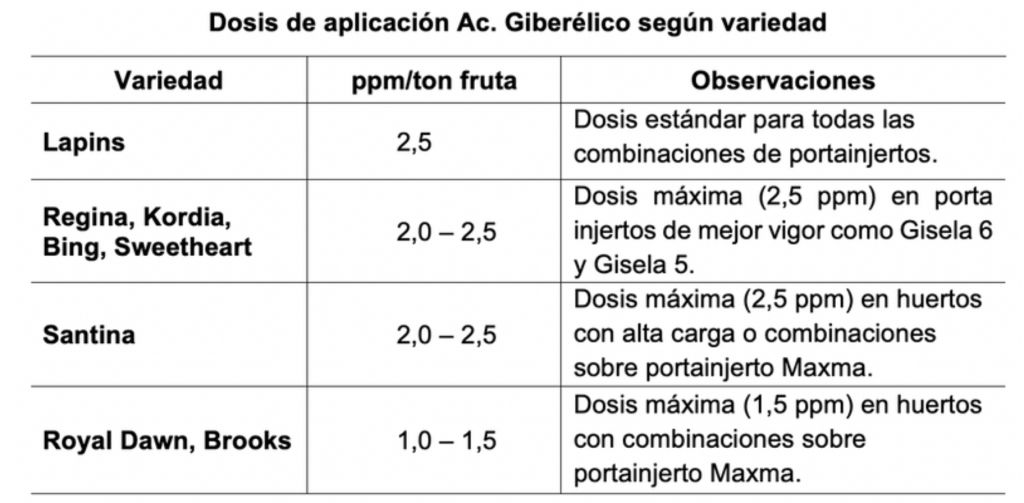La aplicación y dosis de Ac. Giberélico es en función de la variedad y carga frutal.