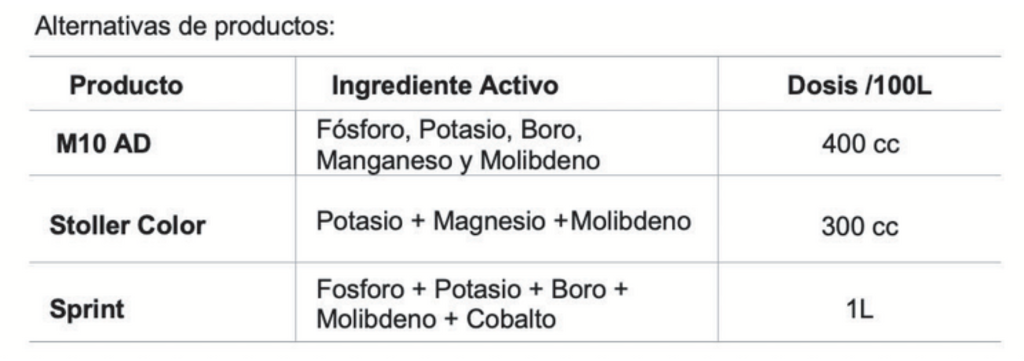 Importante realizar 2 aplicaciones, primera en color pajizo y repetir a los 7 días, para homogenizar color y concentrar cosecha. Lo cual nos permitirá alcanzar una madurez comercial y fisiológica adecuada para cosecha.