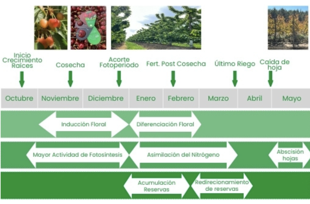 Es importante recordar que la poscosecha inicia desde que se cosecho la última caja de cerezasde cada huerto y No determina el termino de temporada, si no que determina el inicio de la siguiente. Sin duda es la época más importante en la producción de cerezas. Postcosecha, es la época de Formación de Centros Frutales o Dardos, Retorno floral de la siguiente temporada.