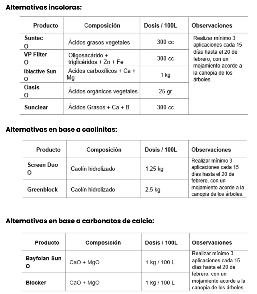 Con las aplicaciones de protectores solares debemos proteger la diferenciación de yemas durante 30-40 días de postcosecha. Realizar mínimo 3 aplicaciones cada 15 días, para cubrir proteger las elongaciones de tejidos que tienen su mayor tasa de crecimiento en los meses de mayor temperatura del año (enero – febrero). De preferencias utilizar protectores solares incoloros, ya que los protectores en base a caolinita impiden la movilidad de los controladores biológicos de arañitas, aumentando el riesgo de un ataque de ácaros fitófagos.