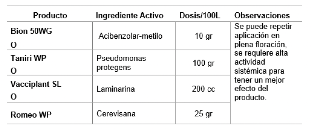 En huertos con alta presión de enfermedades tanto bacterianas como fúngicas, realizar aplicaciones de productos que activan el mecanismo de defensa natural de las plantas.