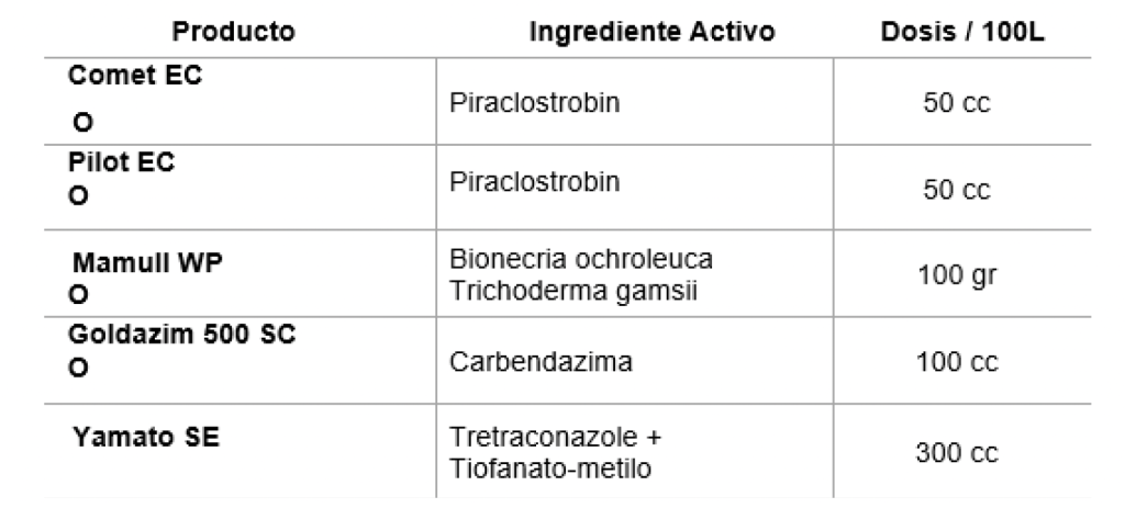 Para el control de plateado y hongos de madera realizar aplicación de fungicida de amplio espectro en postcosecha temprana. Utilizaralguno de los siguientes productos.
