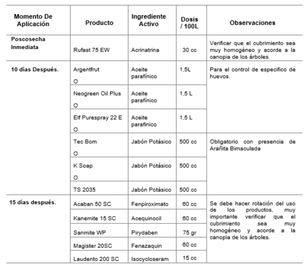 Es importante repetir aplicaciones cada 15 días o en función al monitoreo, principalmente en veranos de altas temperaturas, ya que la tasa de reproducción de estos ácaros aumenta en función a las altas temperaturas.