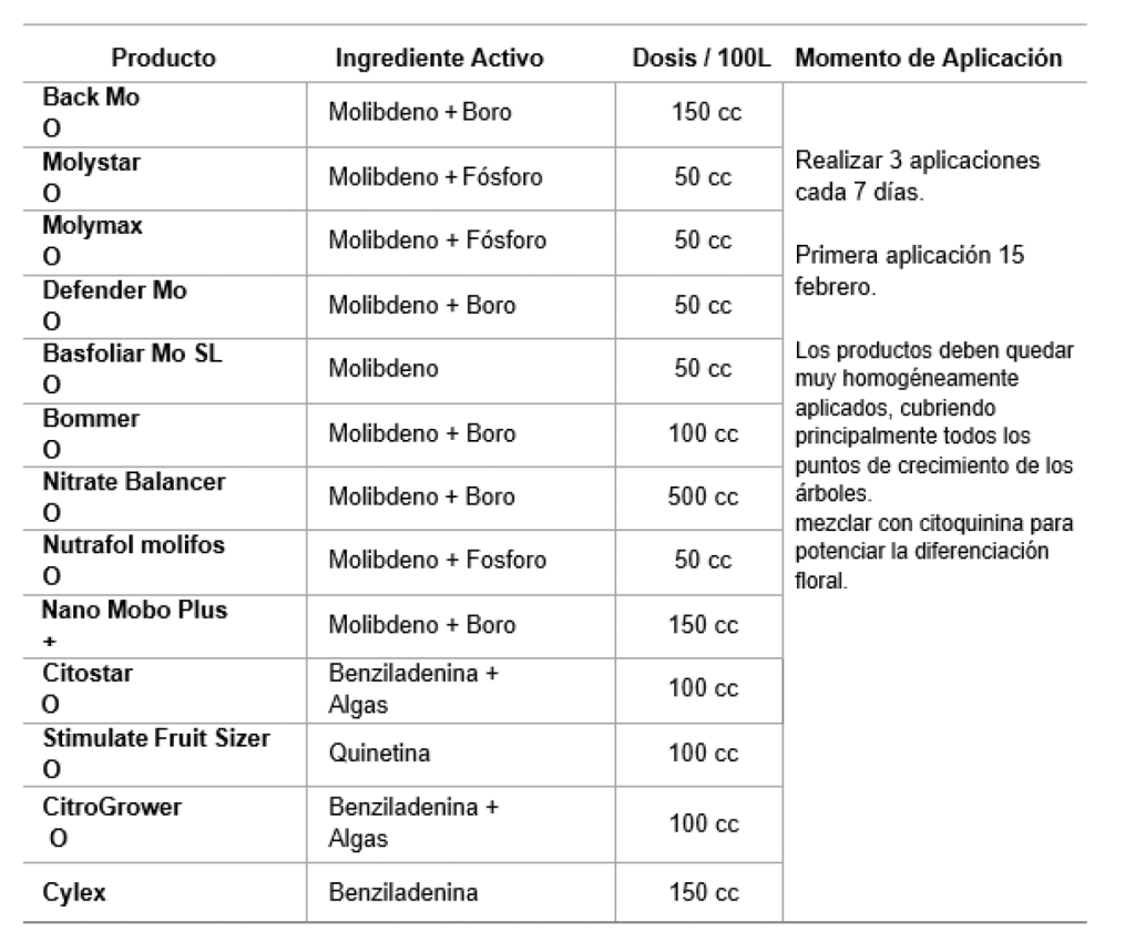 Con el objetivo de mejorar y potenciar la acumulación de reservas en postcosecha, frenar vigor y detener crecimientos se recomienda aplicar producto en base a molibdeno para dar una señal a la planta de iniciar con la acumulación y redirección de foto asimilados desde hojas a las raíces y otras estructuras como tallos y dardos en las que se acumulan reservas para la siguiente temporada. Esta aplicación en mezcla con citoquinina, ya que potencia la división celular en el momento de la diferenciación, mejorando y aumentando el número de células que forman las yemas y dardos, por lo cual entramos en receso con una mejor calidad de estructuras reproductivas que serán flores y frutos en la próxima temporada.